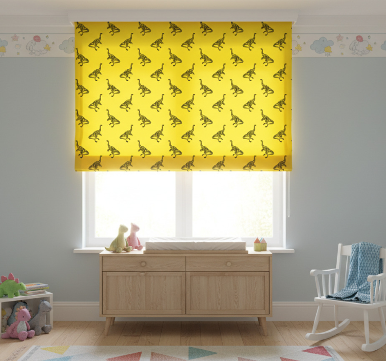 Reference: E7053Bring a touch of adventure to your child's room with our Children room roller blind brachiosaurus symbols yellow. This delightful design features vibrant brachiosaurus symbols in a cheerful yellow hue, creating a playful atmosphere that sparks imagination. The roller blind not only beautifies the space but also serves practical purposes, making it a perfect addition to any children's room!
