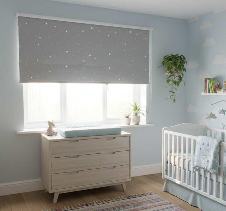 Reference: E7177Transform your child's space with our enchanting Children room roller blind white stars on gray. This delightful design features whimsical white stars gracefully scattered across a soft gray background, creating a soothing yet playful atmosphere. Perfect for sparking imagination and creating a cozy retreat, this roller blind not only enhances the room's decor but also provides essential functionality.