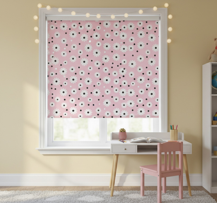 Reference: E7207Transform your child's space with our delightful Children room roller blind with pink black dot flowers. This enchanting design features playful pink and black dot flowers that bring a whimsical touch to any room. The charming floral pattern not only brightens up the decor but also creates a cheerful atmosphere, making it perfect for your little ones. Enjoy the benefits of easy assembly in just 2 clicks and effortless cleaning, allowing you to maintain a fresh and inviting environment!