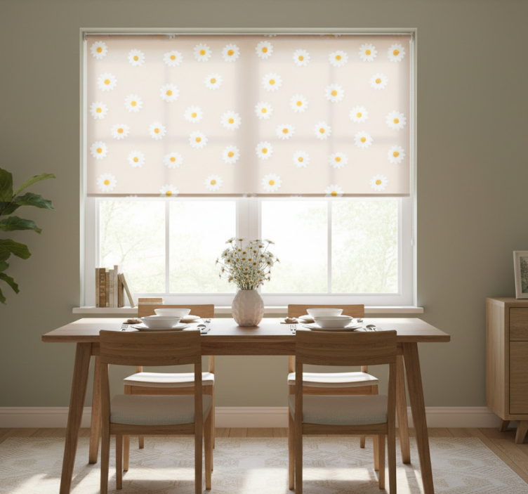 The Dining room roller blind modern daisy design dining room roller blind serves as a perfect decorative element for your dining area. It breathes life into the space with its vibrant floral pattern, creating a warm and inviting atmosphere. Imagine your guests being captivated by the charm of the daisies as they gather around your dining table, making every meal a delightful experience. With the ability to customize the measurements, this roller blind can fit perfectly in any window, enhancing not just the aesthetic but also the functionality of your dining room!