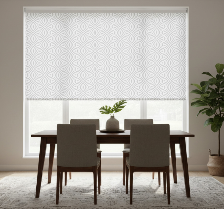 Dining room roller blind with geometric spiral design