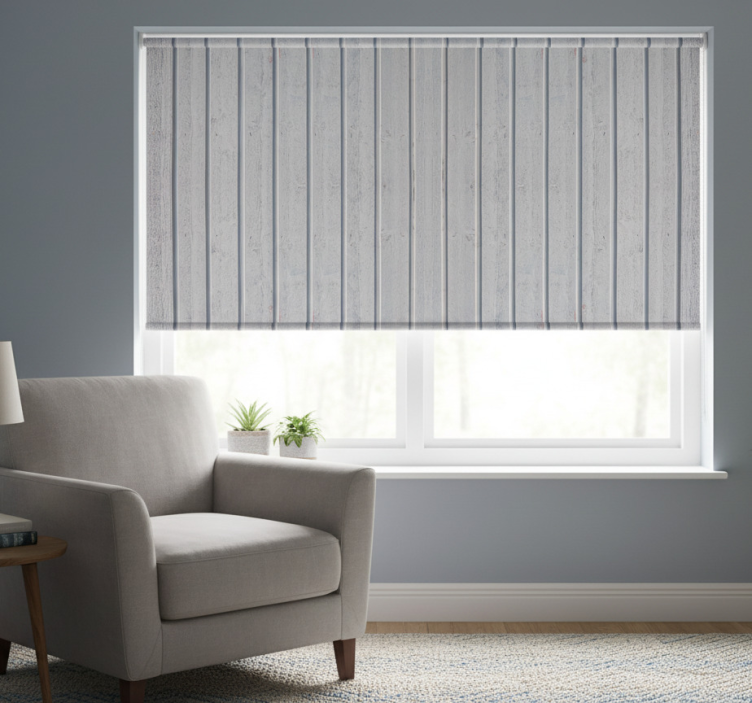 Gray roller blind with white wooden slats