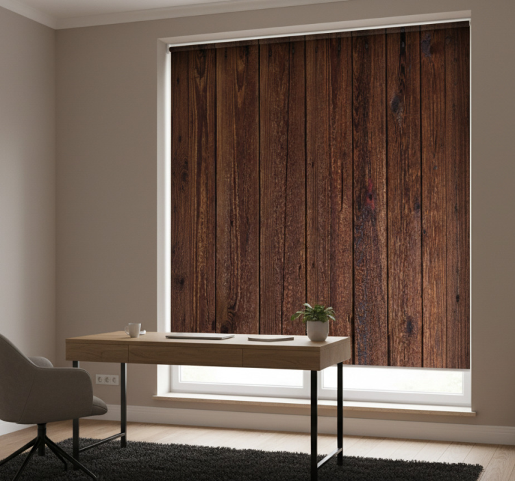 Home office roller blind dark brown rustic wood