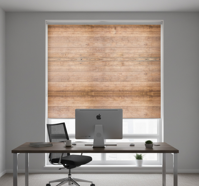 Home office roller blind with horizontal rustic wood