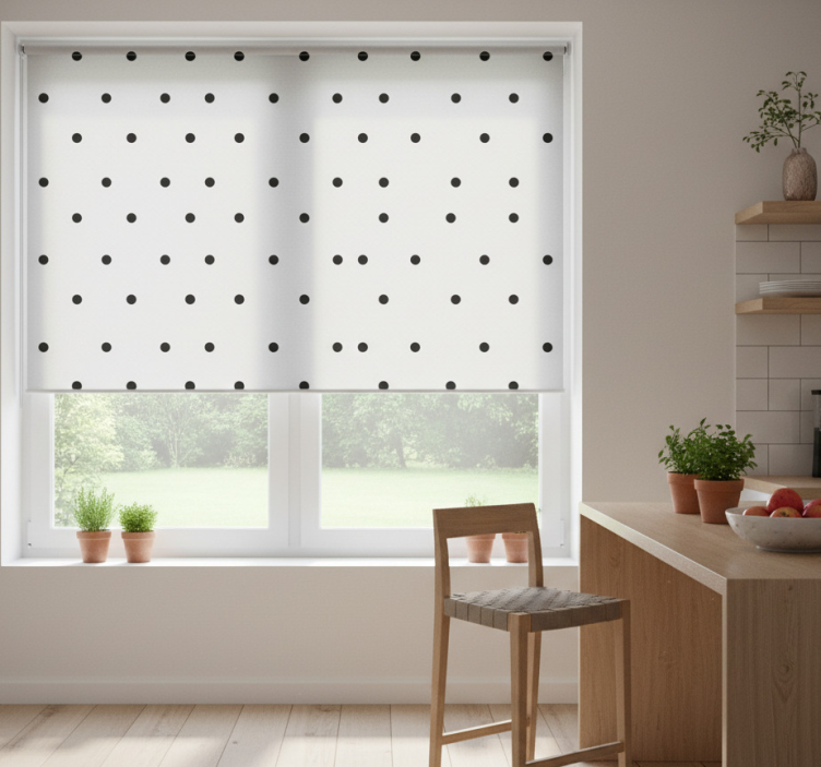 Reference: E6499Transform your living space with our Kitchen roller blind in nordic style black dots, a stunning addition that effortlessly combines modern aesthetics with functional design. The elegant black dot pattern on a crisp background brings a touch of Scandinavian charm to any room, enhancing the overall decor while providing practical benefits. This roller blind is not only visually appealing but also designed for ease of use and maintenance!