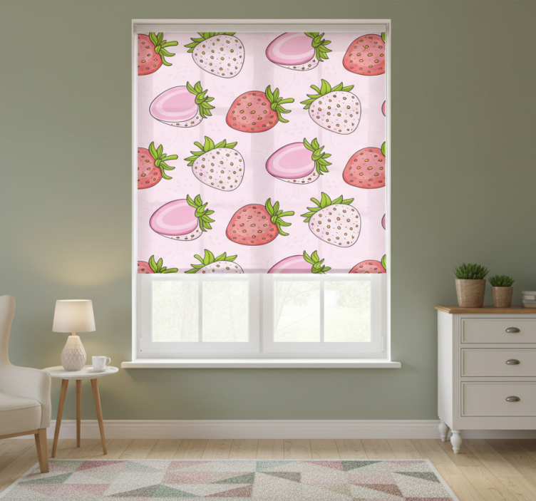 Reference: E8426Transform your living space with our Kitchen roller blind seamless pink and red strawberries! This delightful design features a vibrant display of luscious pink and red strawberries against a seamless backdrop, bringing a touch of nature's sweetness into your home. Whether it's brightening up your kitchen or adding a playful touch to any room, this roller blind is sure to inspire joy and creativity in your decor.