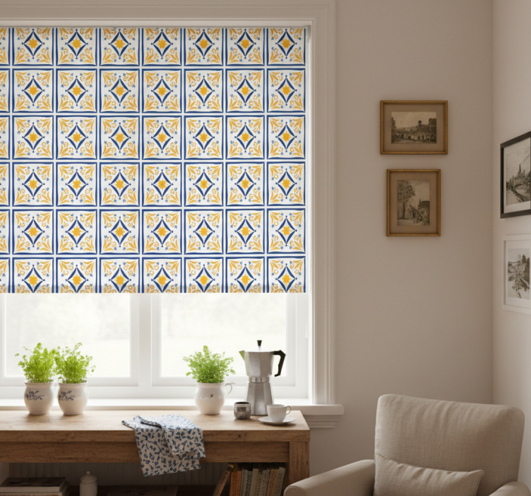 Reference: E6402Transform your living space with our Kitchen roller blind with blue and yellow portuguese tiles, featuring a stunning design that showcases intricate tile patterns in vibrant blue and yellow hues. This eye-catching roller blind enhances any room with its artistic flair while providing practical benefits such as easy assembly in 2 clicks, easy cleaning, and effective sunlight protection. Not only does it elevate your decor, but it also allows you to maintain privacy and regulate room temperature effectively!