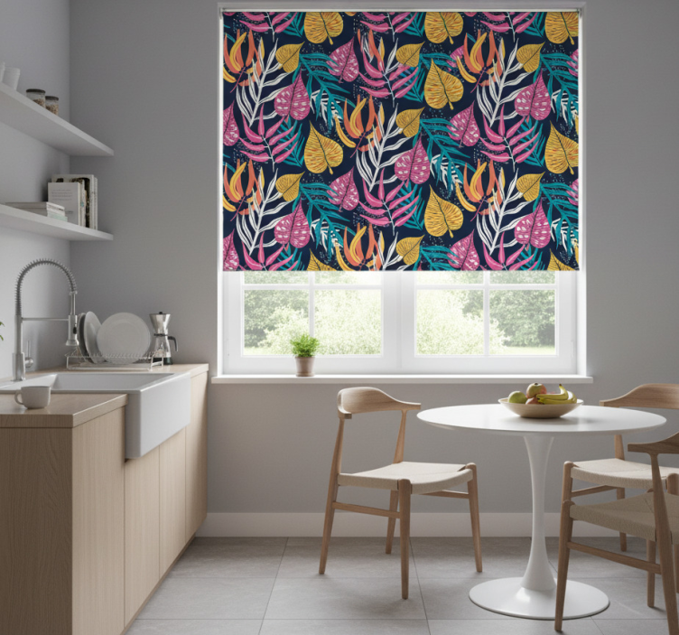 The Kitchen roller blind with multicolor leaves on blue kitchen roller blind is not just a window covering; it is a statement piece that enhances your home decor. Imagine the cheerful ambiance it brings, brightening your kitchen with its lively colors and unique design. This roller blind not only complements your interior style but also adds character and charm, making your space feel inviting and harmonious. Let your windows express your personality and elevate your home decor effortlessly!