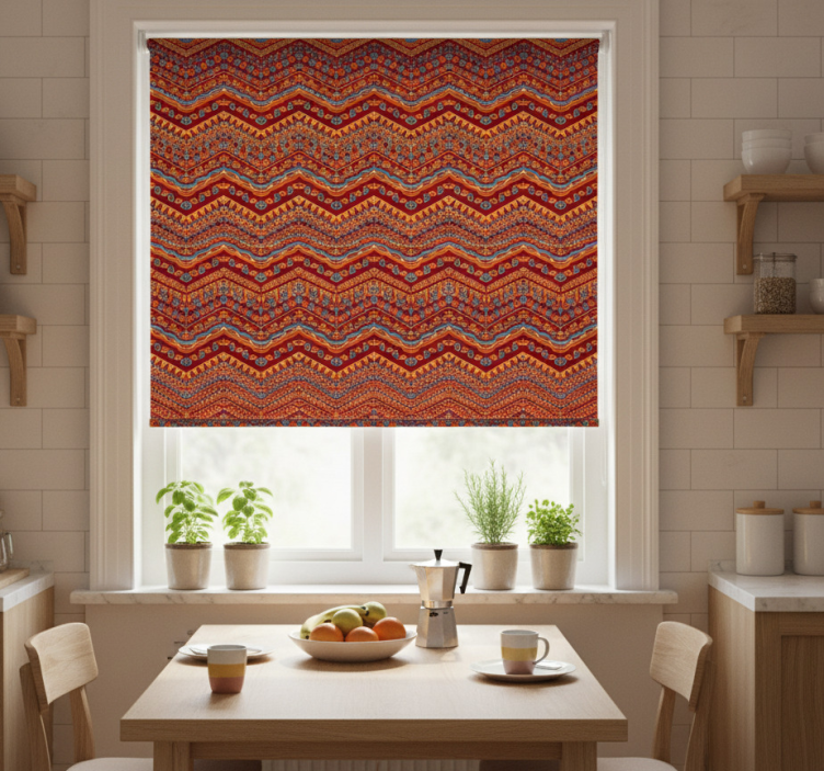 Reference: E6347Transform your living space with our Kitchen roller blind with red tribal patterns, a stunning blend of vibrant hues and intricate tribal motifs. This visually striking design not only captivates the eye but also complements various decor styles, adding a touch of warmth and culture to your home. Made with high-quality materials, this roller blind is easy to clean, ensures privacy when lowered, and protects your room from direct sunlight.