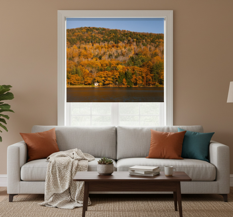 Living room roller blind lake and golden trees