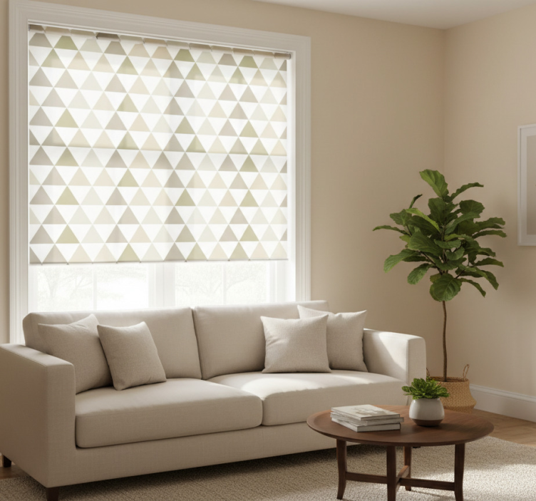Reference: E7770Introducing our stunning Modern roller blind in beige triangle patterns that effortlessly combines style and functionality! This eye-catching design features a unique geometric pattern that adds a contemporary touch to any room. Easy to clean and maintain, this roller blind offers a perfect balance between aesthetic appeal and practicality. With its ability to protect your room from direct sunlight while providing privacy, it enhances your living space beautifully!