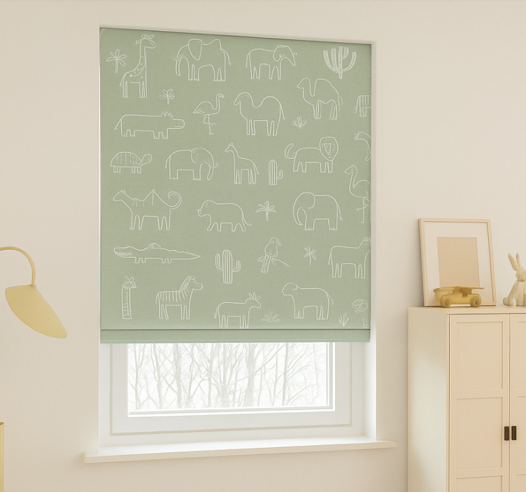 Reference: E6074Introducing our stunning Scandinavian roller blind jungle animal outlines, a delightful addition to your home decor! This unique design features playful silhouettes of jungle animals set against a soft, soothing background, bringing a touch of nature right into your living space. With easy assembly in just two clicks and easy-to-clean fabric, this roller blind not only enhances your decor but also offers practical benefits such as protecting your room from direct sunlight and providing privacy when lowered.