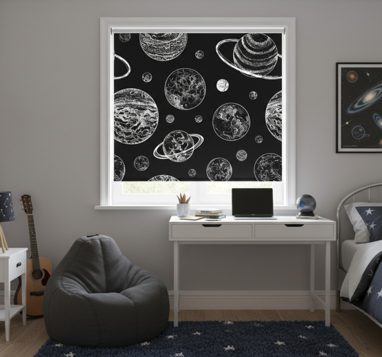 The Teenage bedroom roller blind black and white space teenage bedroom roller blind is an ideal choice for decorating a room with personality. It effortlessly enhances the ambiance and adds a touch of whimsy to any teenage space. The enchanting design creates a magical vibe, encouraging creativity and self-expression. It's more than just a window covering; it’s a statement piece that reflects the unique style of the occupant, making it a must-have for every trendy teenage bedroom!