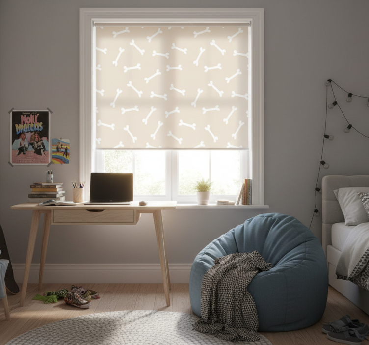 The Teenage bedroom roller blind dog bones on beige teenage bedroom roller blind serves as an inspiring focal point in any room. Its fun design not only brightens the space but also adds a personal touch that reflects the character of its owner. Imagine a cozy environment where your teenagers can express their love for pets while enjoying the stylish aesthetics of their bedroom. Let this roller blind be a canvas of creativity, sparking joy and warmth in their living space!
