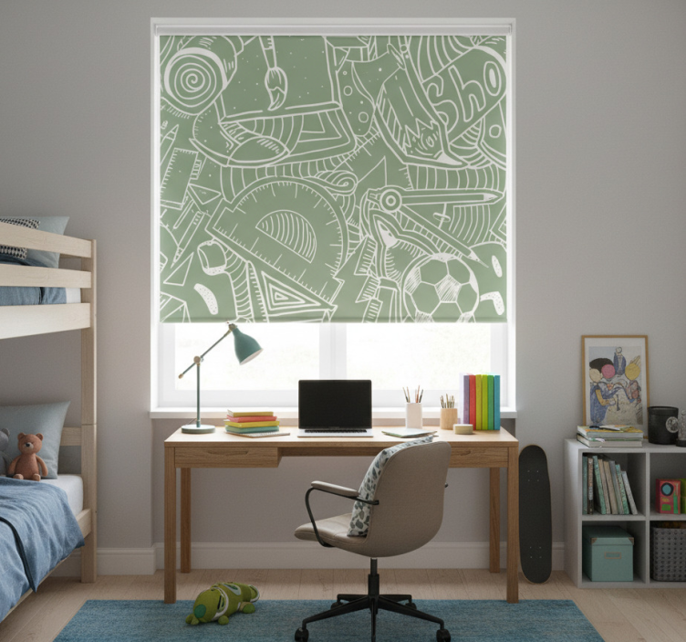 Reference: E7408Transform your space with our Teenage bedroom roller blind green school chalk, a delightful blend of creativity and functionality! This roller blind features a vibrant school chalk design that adds a playful touch to any teenage bedroom. With its easy assembly in just two clicks, effortless cleaning, and quick disassembly, it ensures you can keep your room looking fresh and stylish. The roller blind not only protects your room from direct sunlight but also provides privacy, regulates room temperature, and enhances security by allowing you to see outside without being seen. You can customize the measurements for a perfect fit and choose from three different textures based on your desired light and privacy levels.