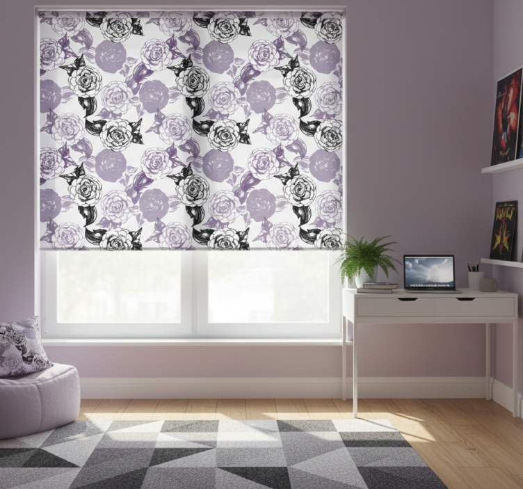 Reference: E7456Transform your space with our Teenage bedroom roller blind in purple and black flowers. This stunning design features a beautiful floral pattern, effortlessly blending shades of purple and black to create a vibrant yet soothing atmosphere. The unique combination of colors and patterns not only enhances the aesthetic appeal of your room but also reflects your personality, making it the perfect addition to any teenage bedroom.