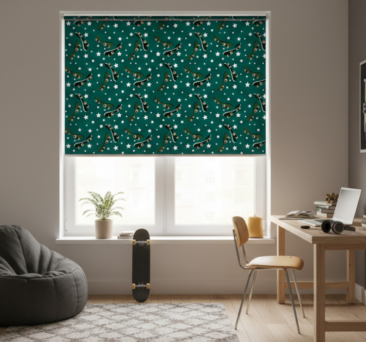 Reference: E7421Transform your space with our stunning Teenage bedroom roller blind skate and stars design! This roller blind brings a unique blend of fun and style, featuring playful skate motifs alongside twinkling stars, creating an inviting atmosphere perfect for any teenager's bedroom. The vibrant colors and whimsical graphics make it a focal point that complements your decor while also providing essential functionality.