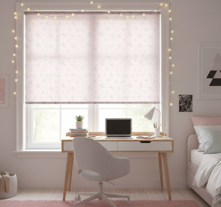 Reference: E7466Transform your space with our Teenage bedroom roller blind white stars pink background. This delightful design features charming white stars scattered across a soft pink background, creating a whimsical atmosphere perfect for any teenage bedroom. The combination of vibrant colors and playful imagery not only enhances the aesthetic appeal but also reflects the personality of the room's occupant!