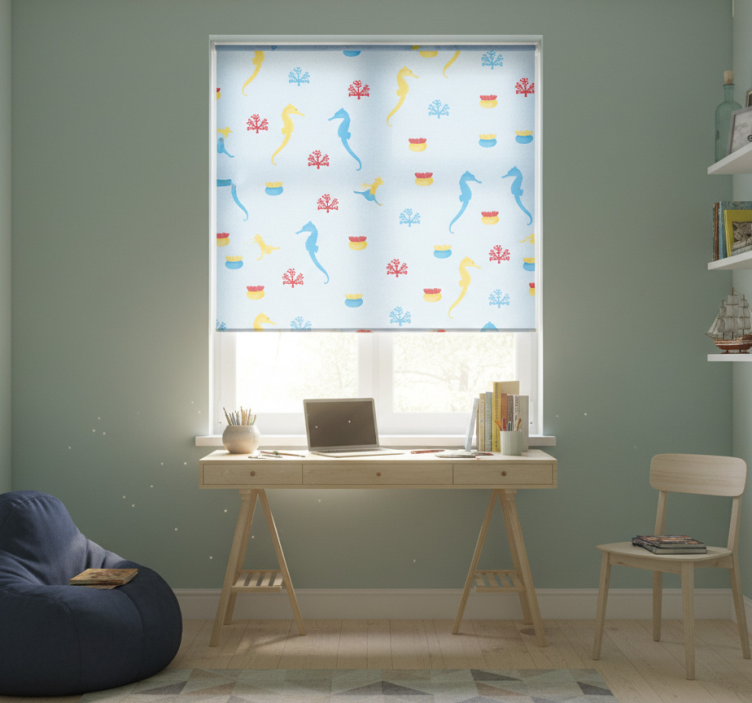Teenage bedroom roller blind with seahorse and coral