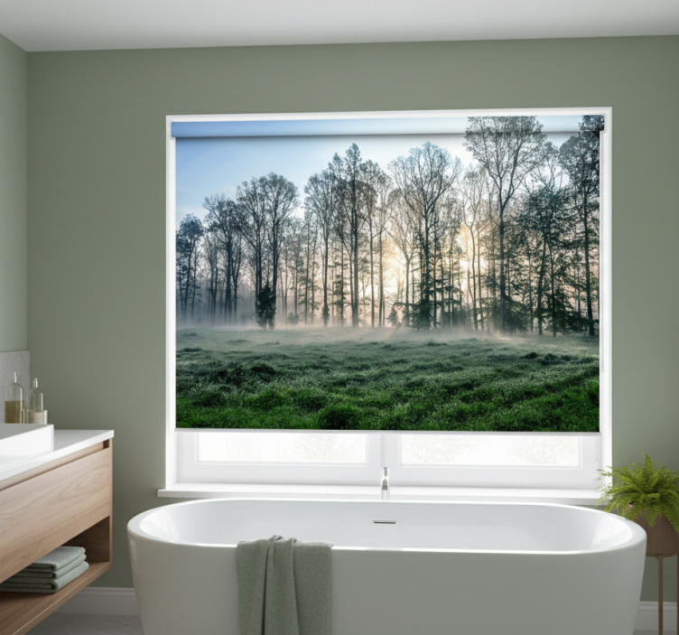 Tree roller blind misty morning meadow