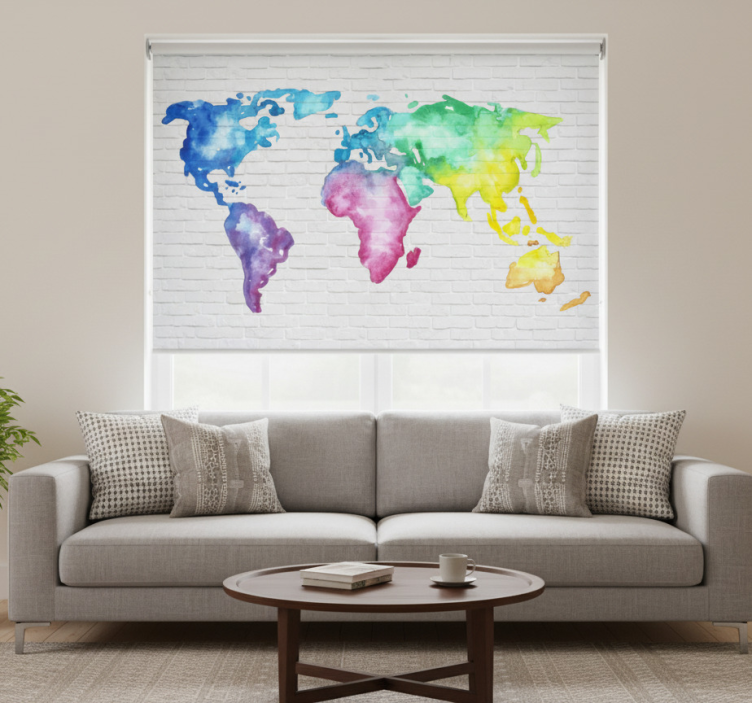 The White roller blind colourful world map mural is an inspiring choice for those looking to elevate their decor. Imagine a room where the beauty of our planet comes alive, encouraging exploration and conversation. This white roller blind not only enhances the ambiance of your space but also serves as a unique artistic statement that reflects your love for travel and culture. Let this mural brighten your home and inspire your dreams!
