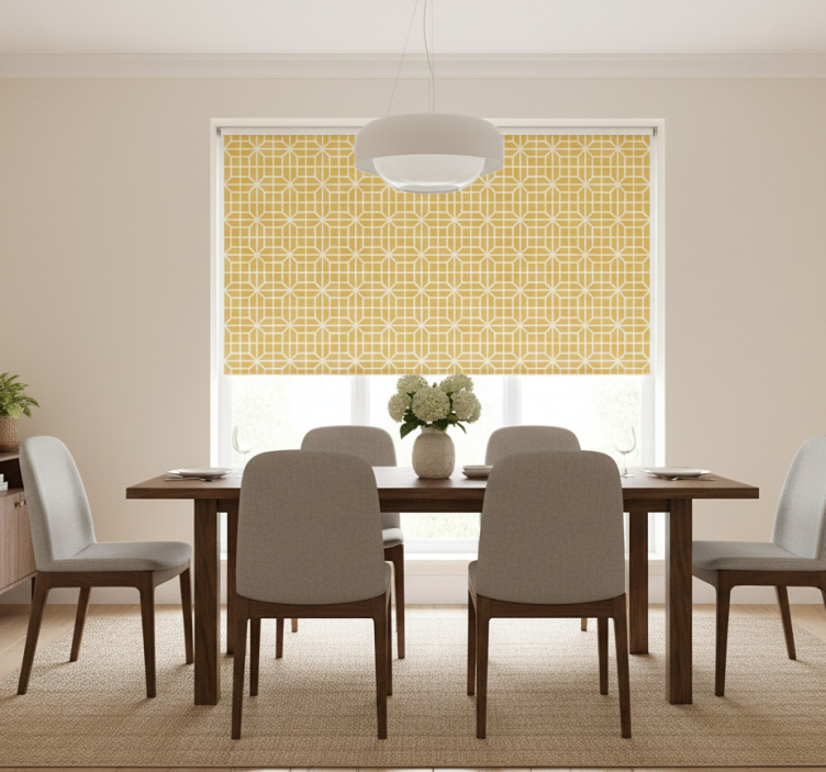 Reference: E8207Transform your living space with our Yellow roller blind with geometric design. This stunning blind features a vibrant yellow hue adorned with contemporary geometric patterns that effortlessly blend style and functionality. The design not only energizes your room but also enhances its aesthetic appeal, making it the perfect addition to any modern home.