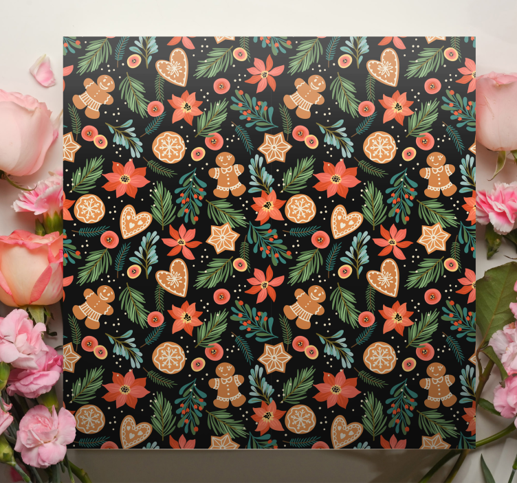 Bring the warmth of the holiday season into your home with our stunning Animal canvas wall art gingerbread holiday designs. This delightful piece features a whimsical combination of leaves, Christmas patterns, vibrant flowers, twigs, cookies, and gingerbread elements, all beautifully intertwined with festive poinsettias, sparkling stars, and charming hearts. The intricate design captures the essence of the holidays, making it a perfect addition to your seasonal decor!