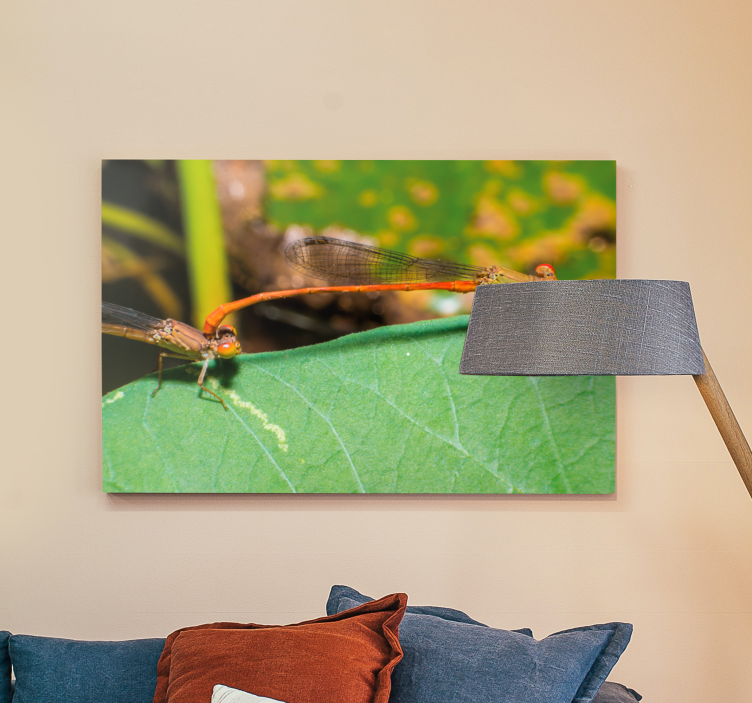 Immerse yourself in the beauty of nature with our stunning Dragonfly canvas pair of dragonflies. This exquisite design captures the delicate elegance of dragonflies perched on vibrant green leaves, showcasing a breathtaking close-up of these magnificent insects in their natural habitat. The combination of detailed photography and rich outdoor elements creates a captivating visual experience that brings the tranquility of nature right into your home.