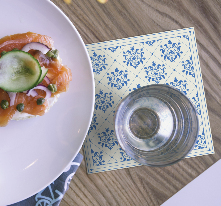 The Coaster with elegant floral design features a stunning tile-inspired graphic that effortlessly combines classic ornamental elements with vibrant blue floral patterns. This decorative piece adds an ornate touch to any table setting, creating a unique blend of texture and beauty that elevates your home decor aesthetics!
