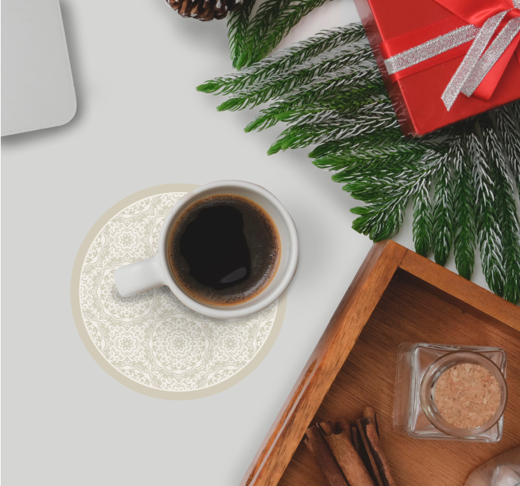 Introducing our stunning Coaster with intricate patterned round surface, featuring a beautifully designed surface that showcases beige tones adorned with exquisite ornaments. The ornamental mandala design brings a classic touch, while the delicate textures and circular shape create a harmonious blend of elegance and functionality. With its ornate appearance and neutral tones, this coaster is perfect for enhancing your home decor with its captivating symmetry.