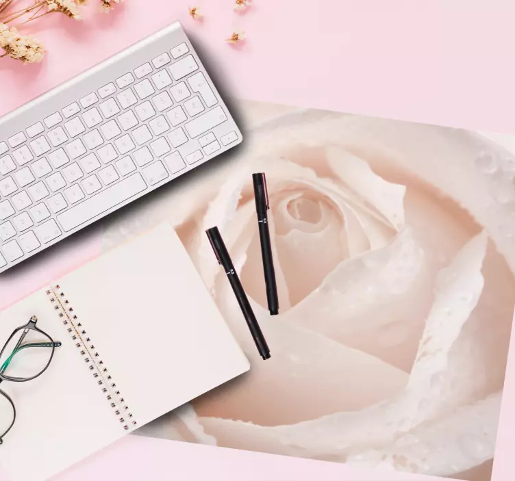 Experience the enchanting beauty of nature with our Original mouse pad delicate floral closeup. This exquisite design features a stunning close-up of soft white rose petals, delicately adorned with water drops that evoke the refreshing essence of rain. The elegant photography captures the pure elegance and texture of the floral arrangement, bringing a touch of natural sophistication to your workspace.