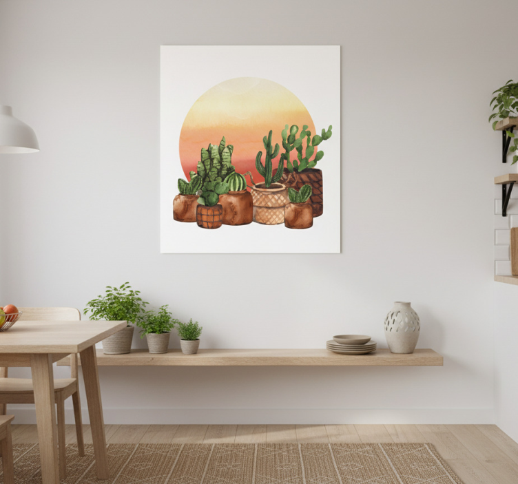 Reference: G657Introducing our stunning Kitchen poster cactus sunset in circle, a vibrant and captivating piece of art that brings the beauty of nature into your home. This design features a mesmerizing sunset with a silhouette of a cactus, all encapsulated within a circle, creating a harmonious blend of colors and shapes. Made from high-quality 180g/m2 grammage, this poster boasts a semi-matt finish that ensures high color intensity and prevents reflections, making it an eye-catching addition to any space.