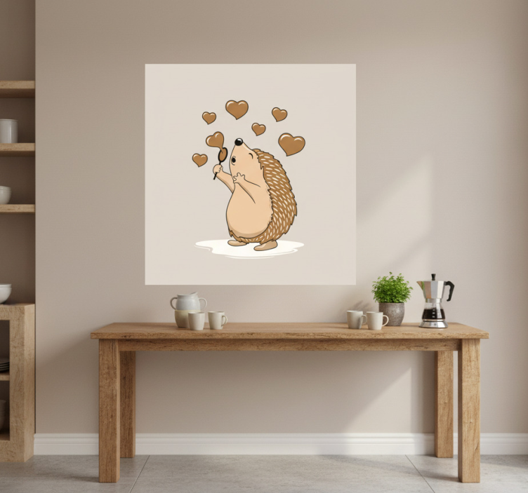 Reference: G601Introducing our charming Kitchen poster hedgehog with love hearts, a delightful addition to your culinary space! This beautiful poster features a whimsical hedgehog surrounded by vibrant love hearts, capturing the essence of warmth and joy. Made with 180g/m2 grammage for durability, it boasts a semi-matt finish that eliminates reflections and ensures high color intensity, making it a perfect choice for any kitchen decor.