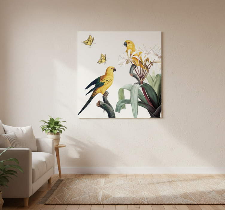 Reference: G811Introducing our vibrant Living room poster of parrots with yellow flowers, a stunning visual piece that brings the beauty of nature indoors! This exquisite design features lively parrots amidst lush yellow flowers, all printed on high-quality 180g/m2 paper. With a semi-matt finish that eliminates reflections, your walls will come alive with high colour intensity, making it an eye-catching addition to any space!
