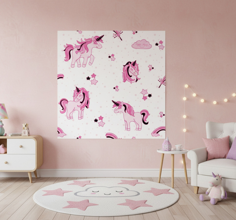 Reference: G915Welcome to a magical realm with our Nursery poster doodle style unicorn world! This enchanting design features whimsical unicorns prancing through a vibrant landscape filled with colorful rainbows, fluffy clouds, and delightful stars. The poster is crafted with 180g/m2 grammage, ideal for posters, and boasts a semi-matt finish without reflections, ensuring high colour intensity that will brighten up any space!