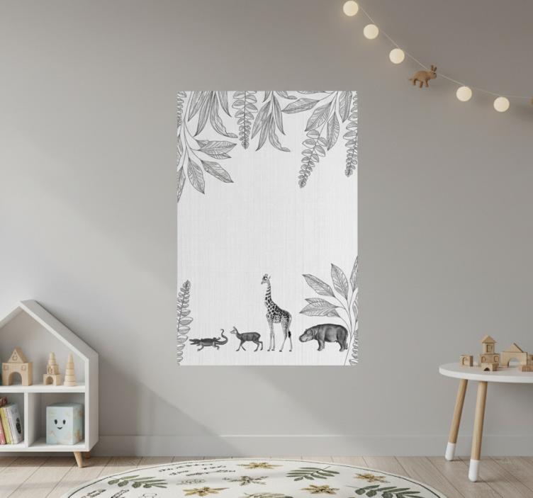 Reference: G941Transform your little one's space with this enchanting Nursery poster with safari animals and trees border. The design features adorable safari animals nestled among lush trees, creating a whimsical atmosphere that inspires adventure and imagination. With a semi-matt finish that eliminates reflections and high color intensity, this poster is printed on 180g/m2 paper, making it a stunning centerpiece for any nursery.