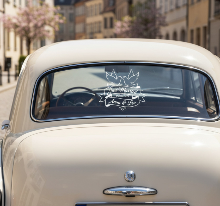 Reference: A54697Introducing our Car sticker just married love doves design, a beautiful graphical representation of love in the form of elegant doves. This design captures the essence of celebration with its romantic imagery and intricate detailing, making it a perfect addition to any newlywed couple's vehicle. The combination of soft colors and graceful shapes creates a stunning visual that resonates with joy and love!