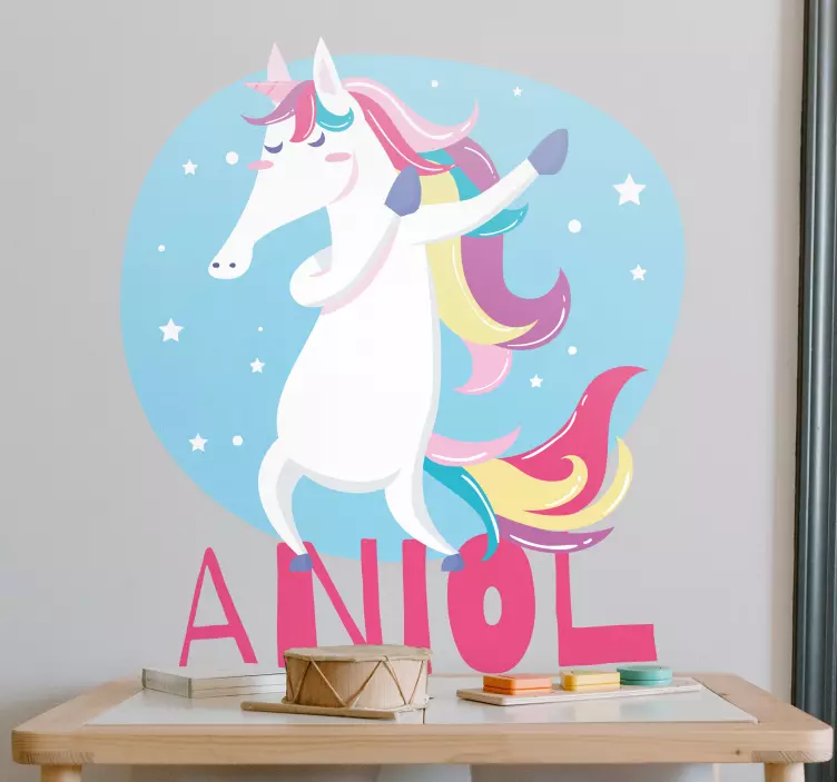 Reference: A47669A vibrant unicorn dances joyfully against a soothing blue backdrop, surrounded by stars. This design captures the whimsical spirit of childhood and imagination, making it a delightful choice for personal spaces. The product can be personalized to add a unique touch.