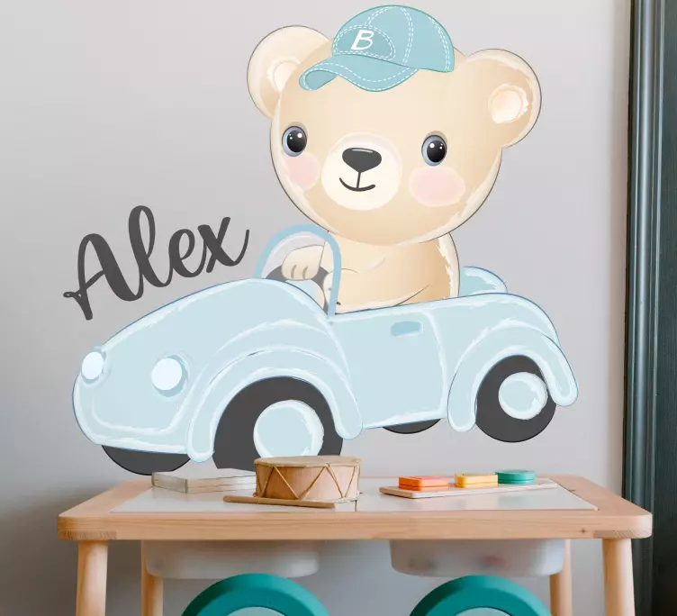 Reference: A48719Charming illustration features an adorable bear in a vintage vehicle, donning a cap. The design evokes a sense of fun and adventure, appealing to children's imaginations. Personalized options add a special touch, making this a delightful addition to any child's space.