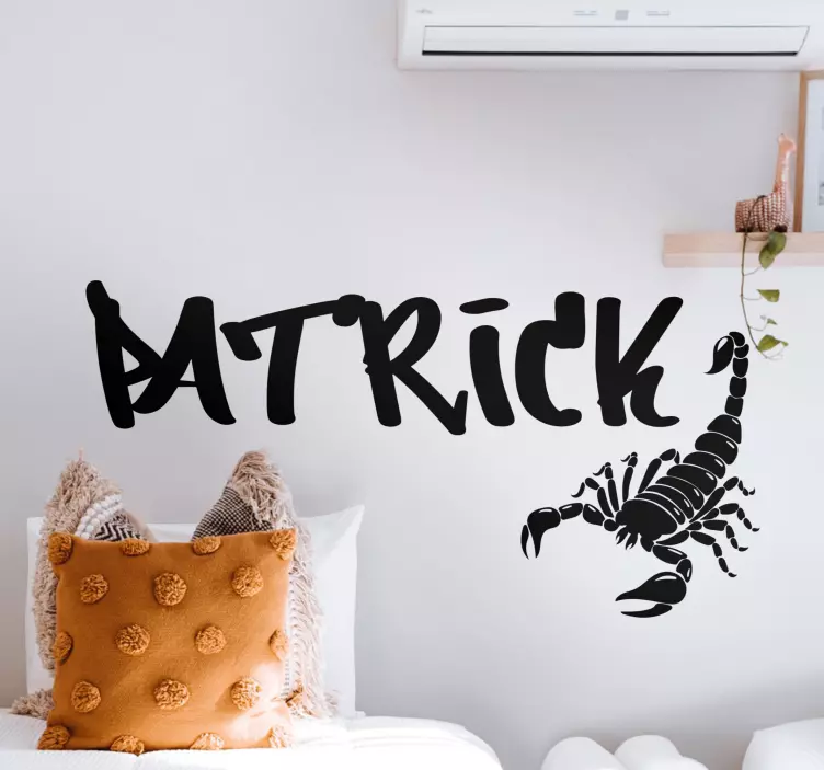 Reference: A49594A striking customizable design featuring a bold scorpion alongside an eye-catching name. This design combines both personality and symbolism, creating a unique statement in any space. Perfect for those looking to add a touch of individuality to their surroundings.