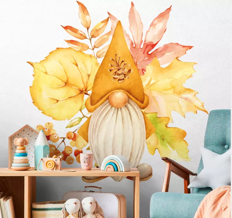 The Decoration wall sticker autumn gnome design is a stunning representation of the fall season, featuring a charming gnome surrounded by vibrant autumn leaves. This watercolour design captures the essence of autumn, bringing the beauty of nature into your home. With its warm colors and whimsical character, this sticker is perfect for celebrating the joys of fall.