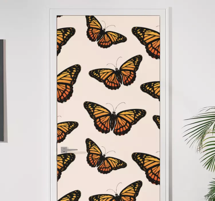 Transform your space with our vibrant Door sticker colorful butterfly illustration! This stunning graphic design features a captivating pattern of majestic butterflies, prominently showcasing the beautiful monarch butterfly in radiant shades of orange. It's not just a sticker; it's a decorative piece that brings the essence of nature right to your door!