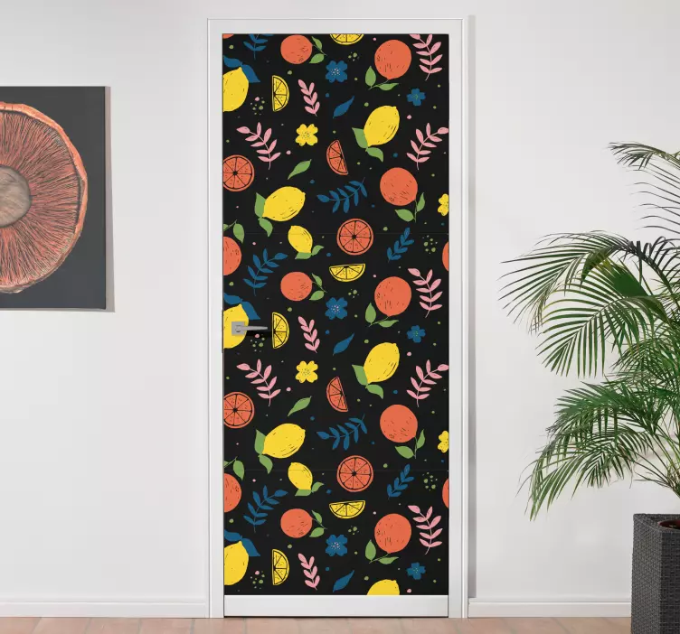 Transform your space with our Door sticker colorful citrus designs, featuring vibrant illustrations of citrus fruits such as oranges and lemons set against a striking black background. This eye-catching pattern brings a fresh and floral touch to your door, instantly brightening up any room. Let the lively colors and playful design create a welcoming atmosphere in your home!