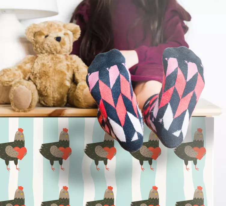 Introducing our Farm animal sticker charming chicken design, featuring an adorable rooster surrounded by hearts and stripes, creating a delightful pattern that brings a touch of the farm to your space! This cute and colorful design is perfect for animal lovers and adds a unique charm to your furniture and decor. Transform any room with this eye-catching chicken motif that beautifully captures the essence of farm life.