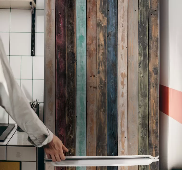 Transform your kitchen with our stunning Fridge sticker rustic wooden planks. This design features a captivating array of colorful, textured wooden planks that evoke a rustic charm. Each vertical plank is beautifully painted to recreate the warmth of natural wood, making it a perfect addition to any interior space. The fridge sticker adds a touch of whimsy while enhancing the aesthetic of your home!