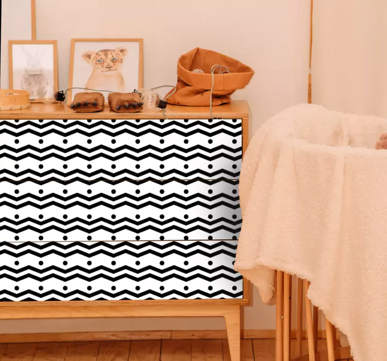 The Furniture sticker chevron pattern design is a stunning blend of black and white zigzag lines that create a geometric, modern aesthetic. This stylish pattern adds a touch of sophistication to any furniture piece, transforming ordinary surfaces into eye-catching focal points.