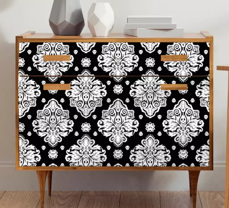 Transform your living space with our Furniture sticker elegant pattern design, a stunning blend of skulls, florals, and damask elements that create an ornate black and white aesthetic. This modern style furniture design enhances any home interior with its unique, eye-catching ornate pattern that invites conversation and admiration!