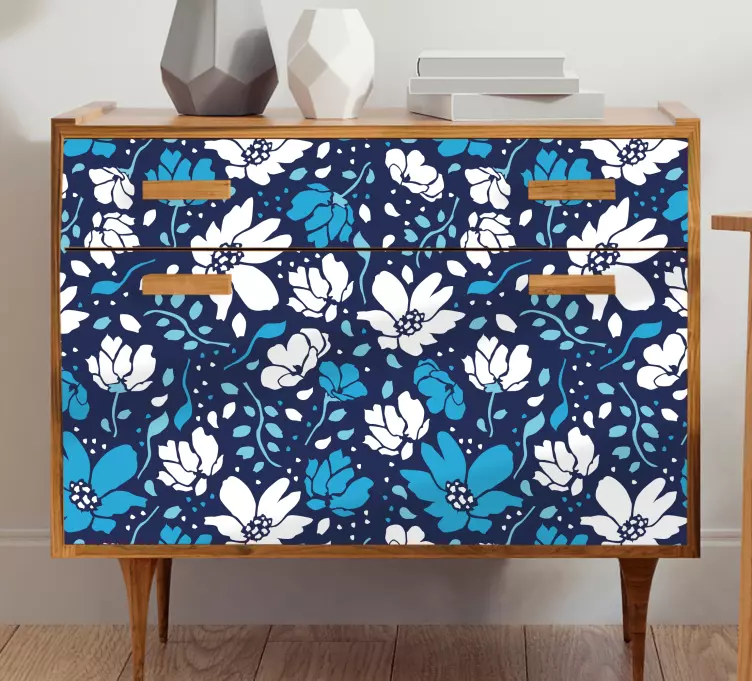 Transform your space with our exquisite Furniture sticker floral motif drawers, featuring a stunning design that intertwines delicate daisies and vibrant florals. The beautiful blue and white color palette, complemented by leafy accents, captures the essence of nature and brings a touch of freshness to your furniture. This delightful pattern is perfect for adding a charming focal point to any room!