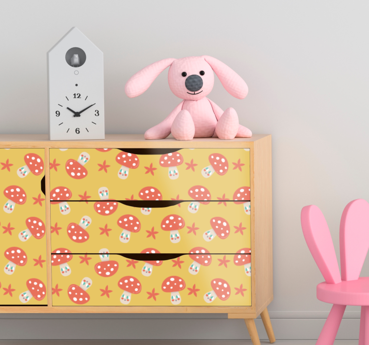 Introducing our delightful Furniture sticker mushroom pattern design, featuring a whimsical array of fly agaric mushrooms set against a vibrant yellow background, sprinkled with charming stars. This playful design is perfect for adding a touch of magic to any furniture, making it an ideal choice for children's decor! Transform your space into a whimsical wonderland with our enchanting stickers!
