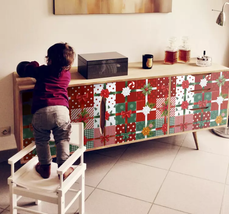 Introducing our delightful Holiday sticker for festive gift wrapping, designed to bring joy to your celebrations! This charming sticker features a mix of furniture, gifts, and a christmassy theme, adorned with red and green colors. The pattern showcases squared shapes and decorative bows, making it a perfect addition to any presents. Elevate your holiday spirit with this unique design!